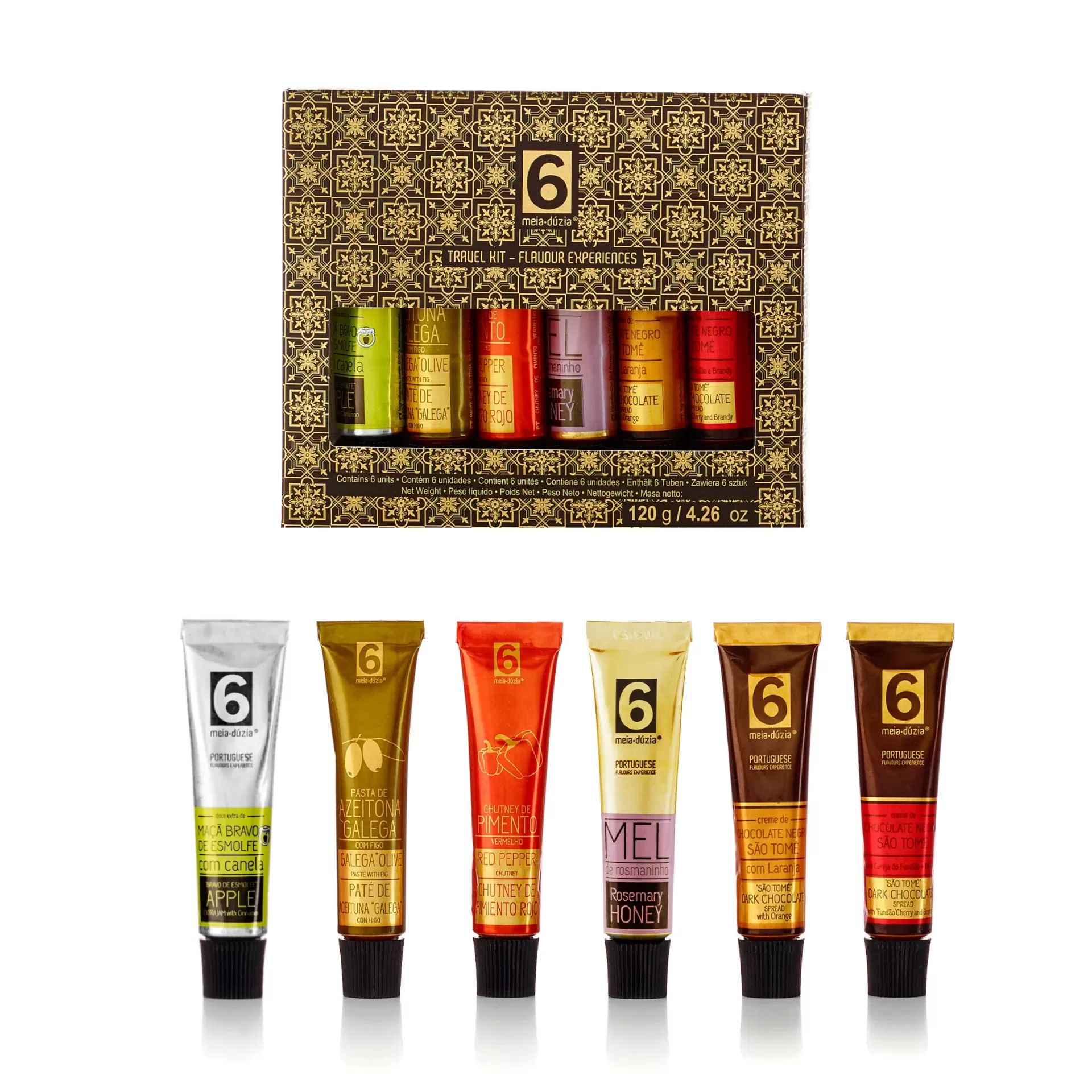 Kit de 6 sabores, inclui Doces, Chocolates, Pasta de Azeitona, Mel e Chutney. Uma oferta original e variada, com sabores doces e salgados, para quem gosta de experimentar diferentes combinações gastronómicas.